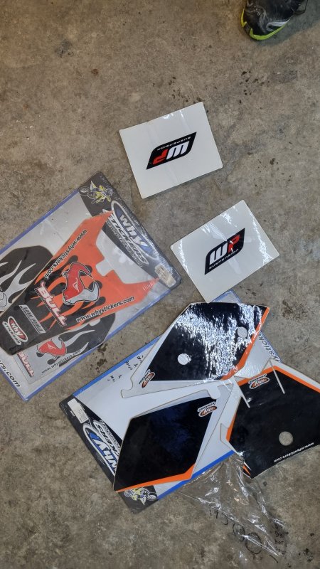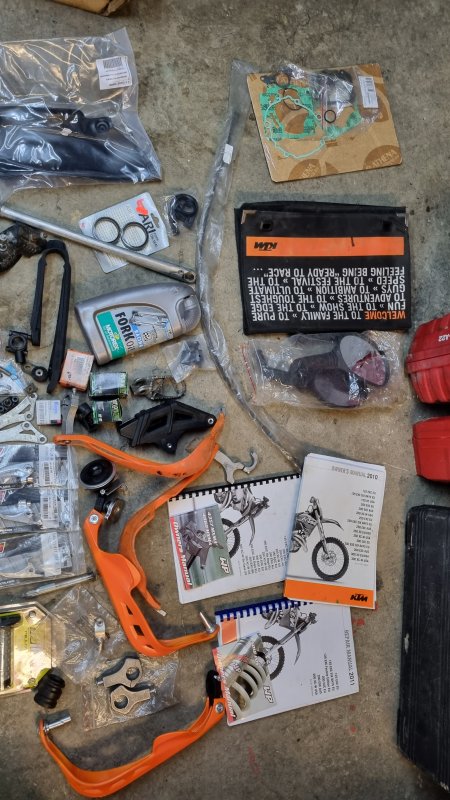 Napr.: startér na 2016 z ali, přepákovaná páčka na Magura spojku, koleno ktm racing jeté 5mth, filtry, plasty, lanko plynu, manuály, nějakéfiltry a plasty z exc 400 cca 2005, polepy...