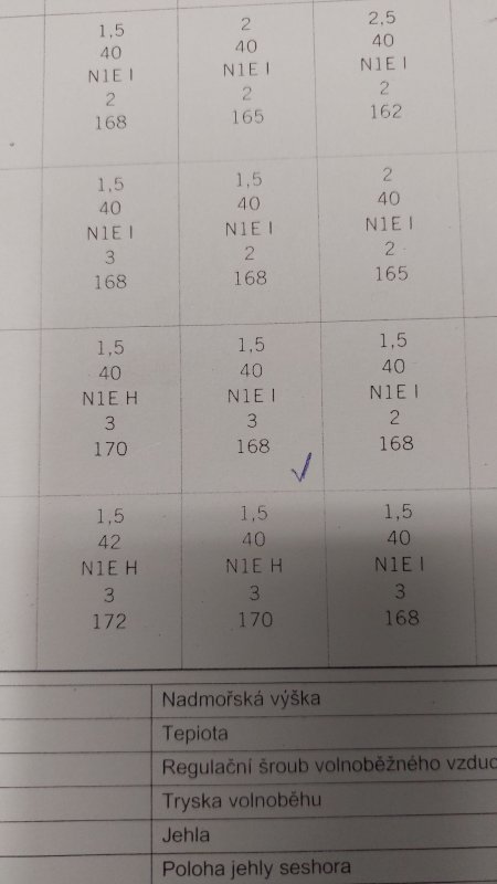 Jezdim taky puvodni nastaveni, tryska 168 je v tryskovem bloku zajistena zalisovanim. Nejezdim zadny velky palby, taky skoro cely rok a svicka ma stale peknou barvu. Jedine s cim jsem zatim hybal byl vzdusnik.